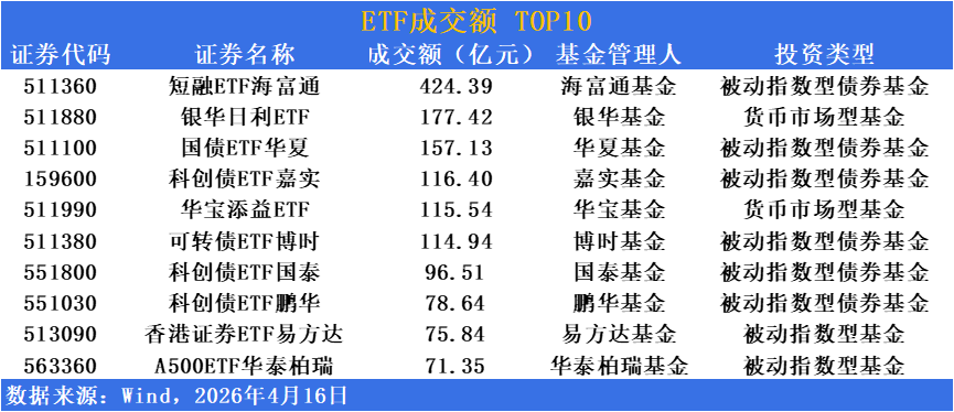 短融ETF海富通(511360)单日成交超424亿元稳居成交榜榜首,作为短久期信用债工具持续担当资金管理利器,受益于市场资金面宽松背景下的现金管理需求升温。