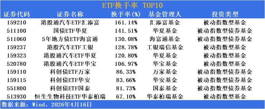 债券型产品同样热度高企,国债ETF华夏(511100)换手率超141%,5年地方债ETF海富通(511060)换手率超130%,科创债ETF万家(159110)、科创债ETF华安(159115)及科创债ETF国泰(551800)换手率均超81%,进一步印证股债两市资金对高流动性工具的追逐,以及债牛行情下交易型资金的积极参与。恒生生物科技ETF华泰柏瑞(513930)换手率超67%,显示资金对港股医药成长赛道估值修复的积极布局。